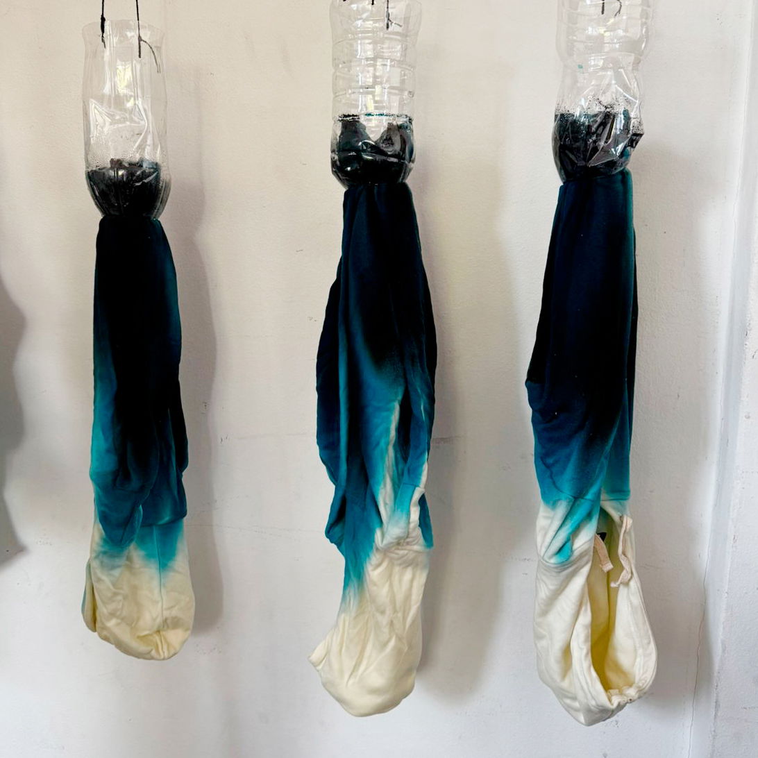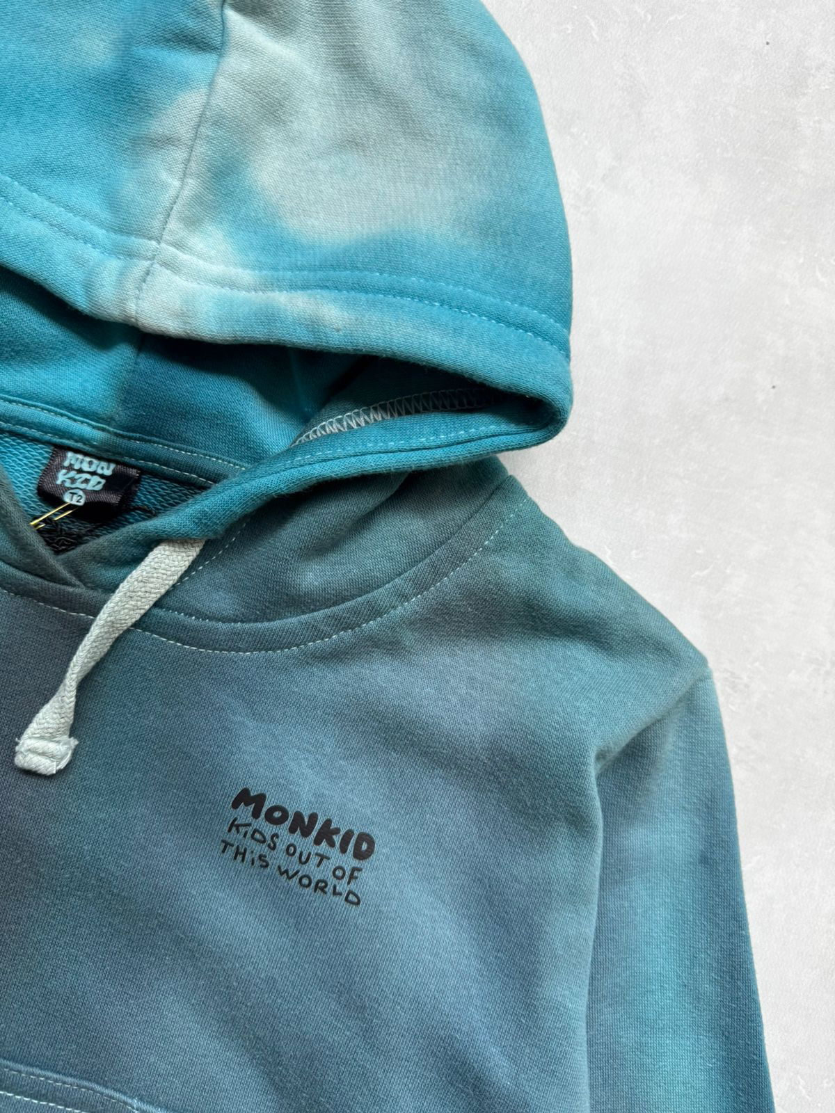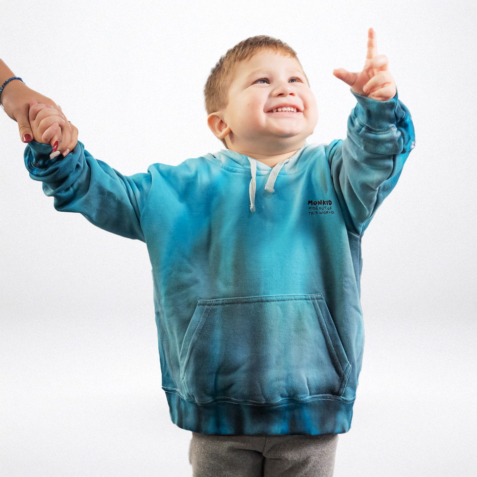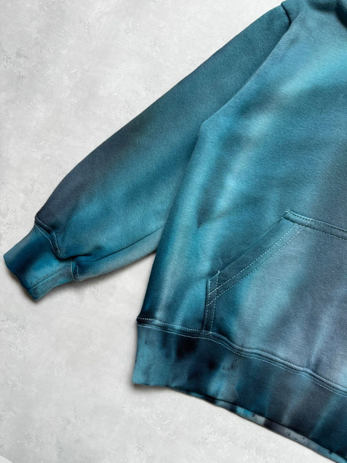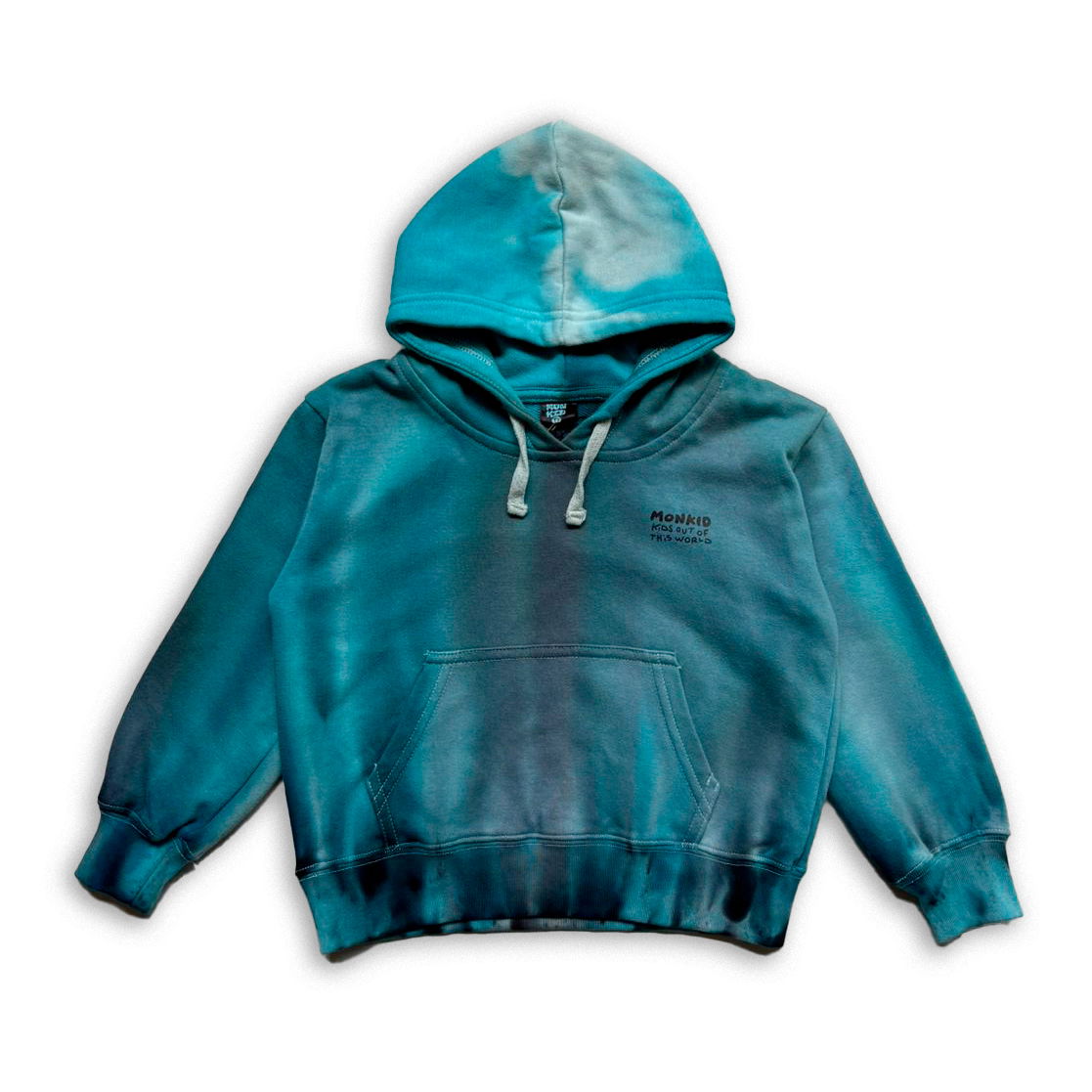 Este buzo paso por un proceso de teñido por deshielo, bajo el efecto de la gravedad, fue lavado y planchado para asentar los colores