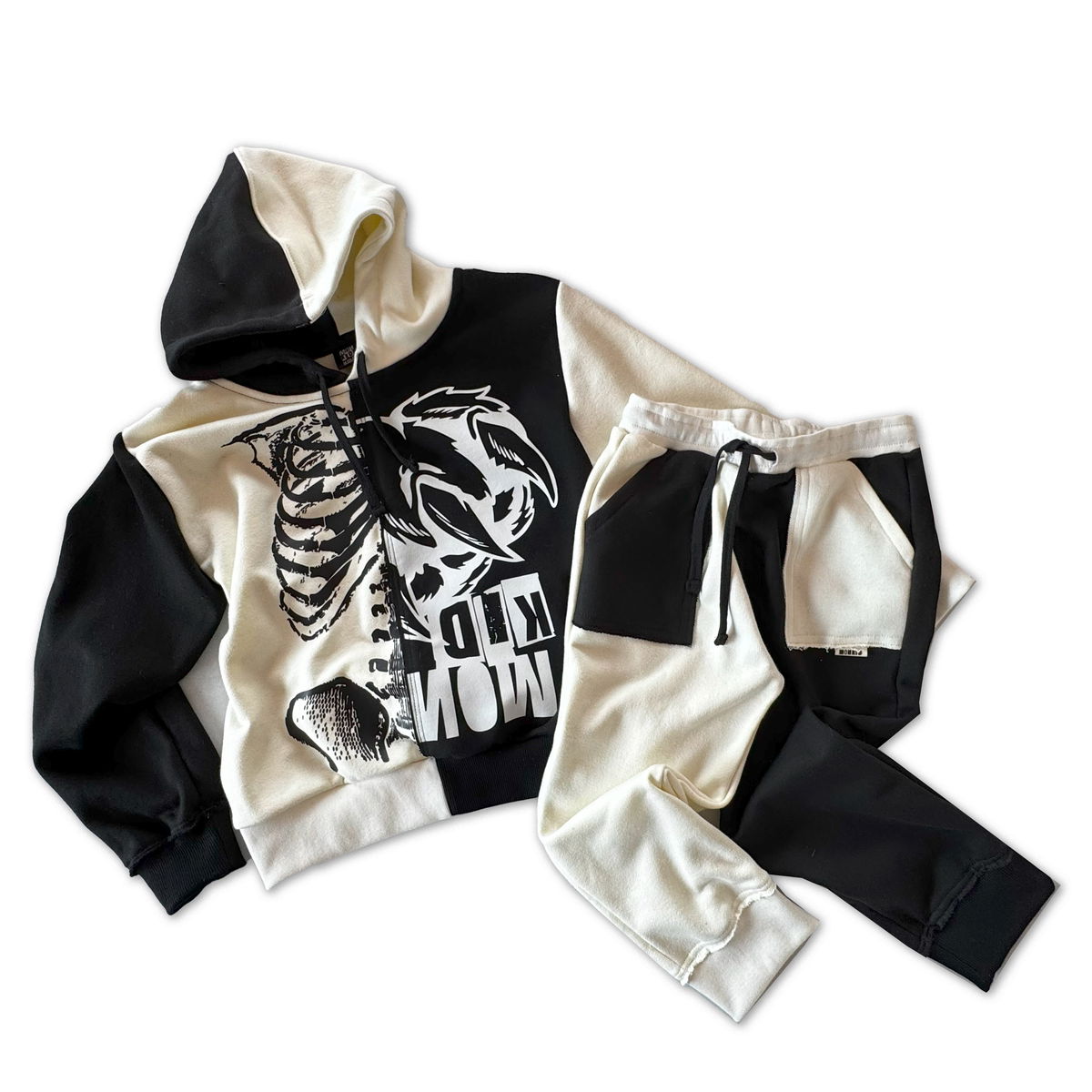 Costuras superpuestas, al corte y estampas a contratono para dar un look punk trash.
